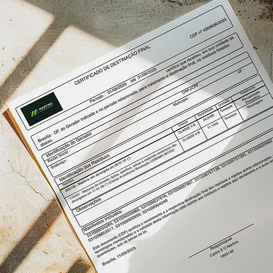 A certificação assegura destinação legal e sustentável dos resíduos, com licenças do IBRAM, IBAMA e SLU e emissão do Certificado de Destinação Final (CDF).