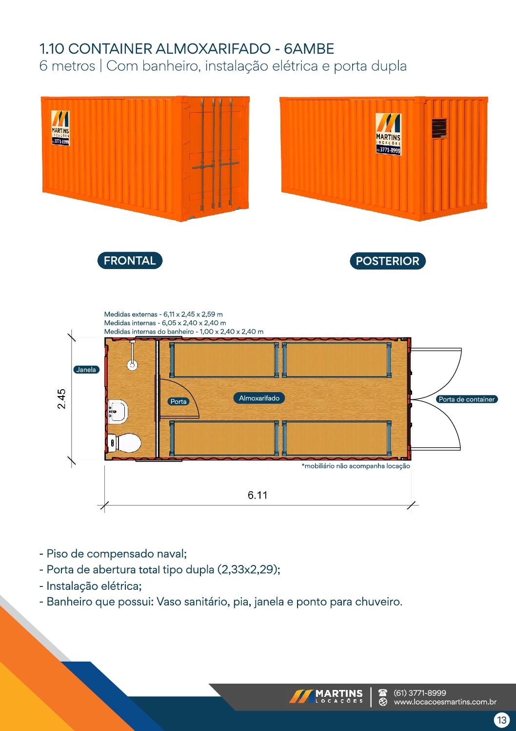 Container almoxarifado 6m com banheiro e elétrica