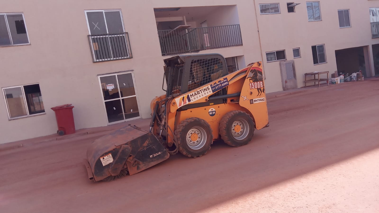 Aluguel de bobcat - mini carregadeira com vassoura angular, indicada para o deslocamento e trabalhos de limpeza de entulhos em obras de pavimentação, calçadas, pátios, pista de pouso entre outros. A locação da vassoura para mini carregadeiras é um implemento versátil e fácil de operar.